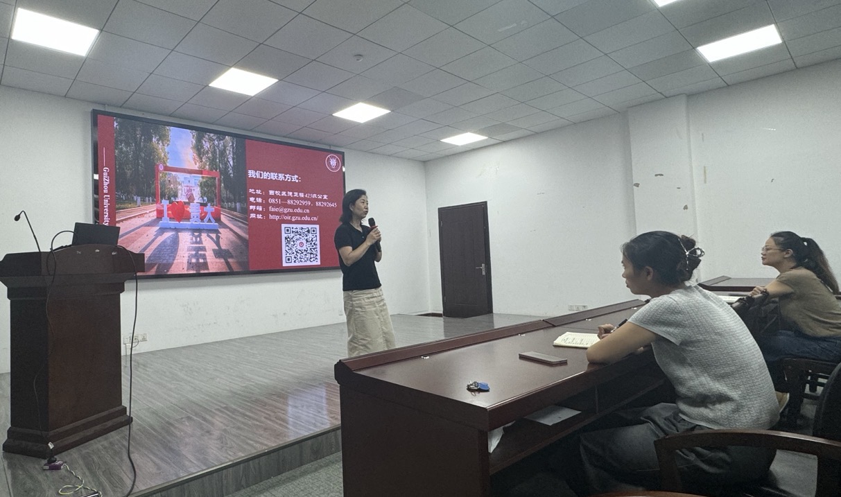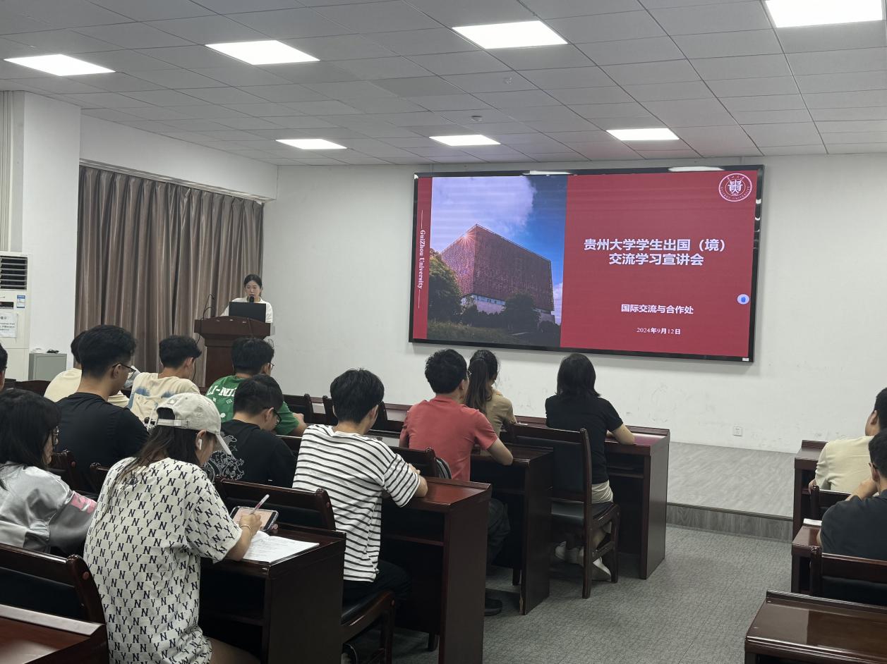 2024年9月12日,學院邀請貴州大學國際交流處郝婧老師到我院開展“百人留學預科”項目宣講,學院黨委副趙曉丹、教學副院長劉敏教授、輔導員老師出席會議,21級、22級及23級共百名同學參加本次宣講。